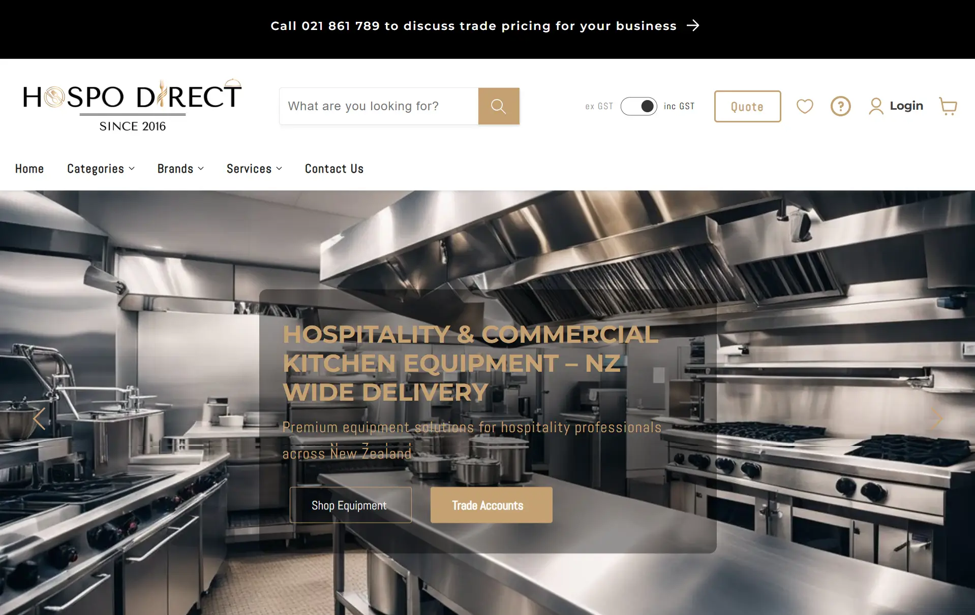 I designed and developed the Hospo Direct e-commerce and business site for a supplier of commercial kitchen equipment and hospitality solutions across New Zealand. The site supports easy product browsing, clear service information, and direct customer engagement.