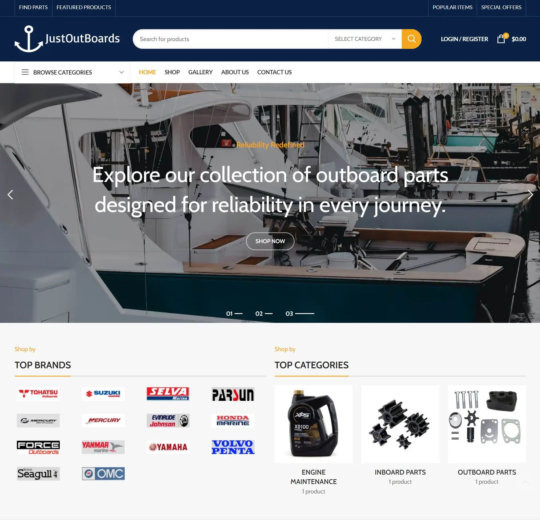 • Special offers and promotions area to highlight deals or featured items. (justoutboards.co.nz/special-offers)